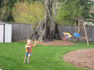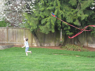 It was a beautiful sunny day and so the boys got to play outside in our backyard with the blossoms blooming above them. Then we started out on a bike ride only to realize that it was maybe just windy enough for the kites I’d been saving for a windy day. We pulled them out and tried to find a big field nearby but all were taken and the wind just wasn’t very strong so I told them I was giving up. Catastrophe-note to self-just let them try it even when there is no wind. They begged and pleaded to go out in the back yard to try them and lo and behold they worked BEAUTIFULLY. They had a great time running around and around the yard with their Spiderman and Transformer kites blowing in the breeze behind them. Mr. President took every opportunity to point out that he had been right about trying them even without much wind and that I’d been wrong and later informed me of this deep insight; “The weathermen are right most of the time but they’re wrong some times just like Moms are right most of the time but wrong some times. Though his grandmother Wesel will roll over in her not even dead yet grave, it is true that he’s already figured that little secret out. And today I was thrilled to be wrong just to see the glee on their faces as they ran themselves silly in the wind.