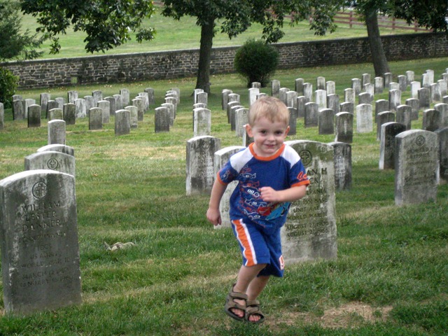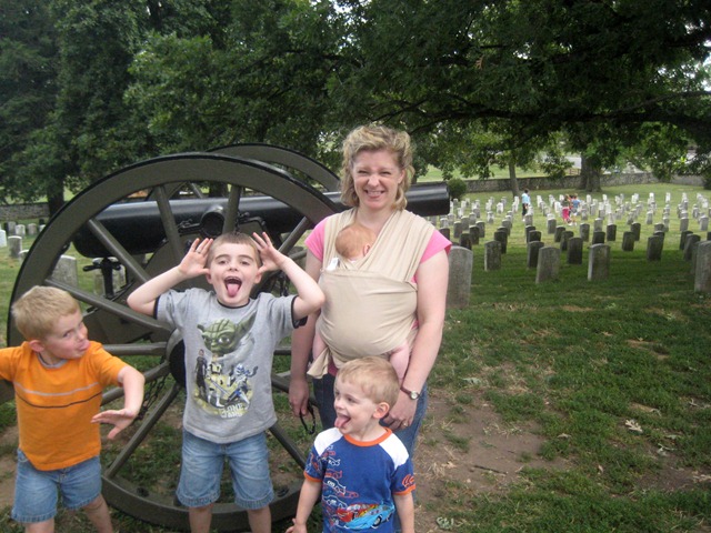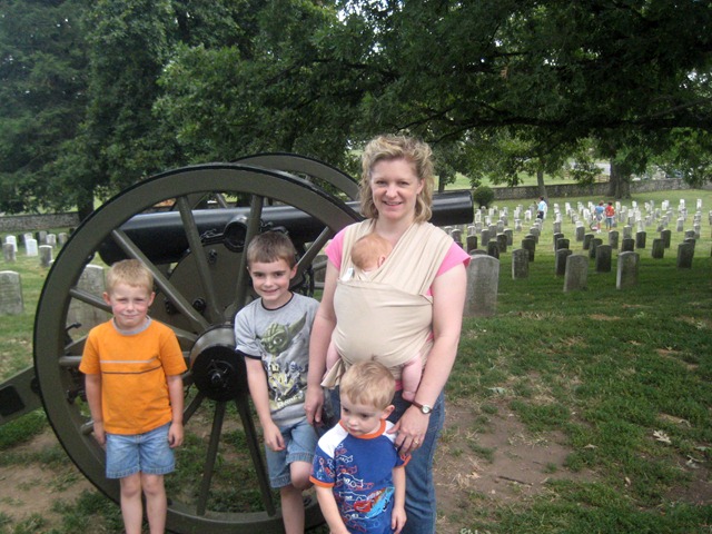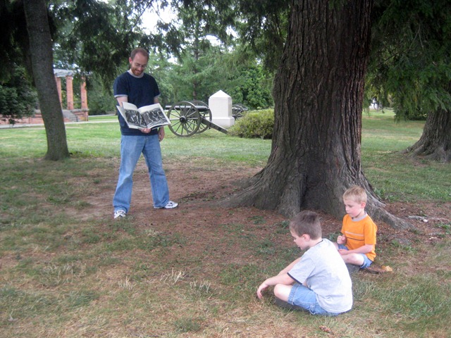 On day 2 we drove to Gettysburg. It probably goes without saying that by the time we got there, the boys were fighting in the back seat, now tired of our little adventure, Ladybug was not happily sleeping all day like she had the day before and Mom and Dad’s patience was wearing thin. So we did Gettysburg in fast forward. I still insisted that we do a few things because we had driven all that way and I wanted to get at least SOME history learned or at least experienced. I was not about to let them see Gettysburg without listening to the Gettysburg address- read in Dad’s most convincing Abe Lincoln.