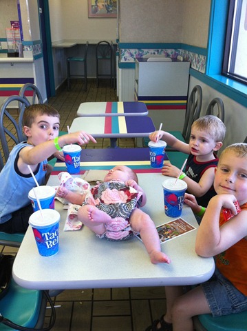 Smart parents would have quit then. But no, we decided to keep going and hit Chocolate World in Hershey PA the same day. On the way we stopped at Taco Bell to eat dinner. Trying to feed 4 little kids at a restaurant is no easy task and at times I didn’t have enough hands….