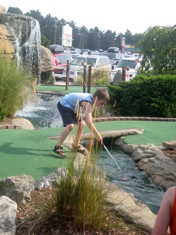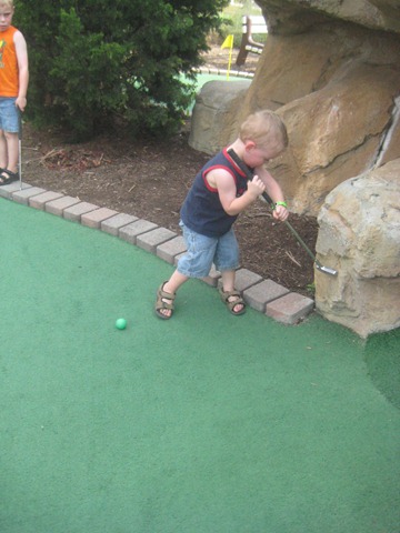 We were feeling pretty good about ourselves and so we decided to do the miniature golf course. We, intelligent parents that we are, thought it would be fun to do as a family. Yes, that’s right, with all 4 children under the age of 8. So we marched ourselves in, got everyone their weapons, I mean golf clubs, and headed to the first hole. The girl at the desk looked at us like we were crazy, but we headed out clueless. What ensued can only be described as complete and utter chaos. Kids running in every direction, balls flying through the air and into water, clubs waving, parents chasing, two year old climbing, 7 year old whining, 6 year old careening and baby crying. I off roaded with the stroller through the trees, rocks, waterfalls and streams trying to keep up with Blue Jeans as he hit his ball everywhere BUT in the holes. Rock chased after Go Go who hit his ball once at each hole as hard as he could and then ran on to the next one determined to get to the end as fast as he could. Mr. President, the only one old enough to care about the game being done the right way, stood there and complained that no one was doing it the right way! If you’d been a bystander, this is what you would have heard, “Wait!, No, Stop! Don’t throw your club in the water!” “No fair, he’s using his hands to put the ball in!” “Cool, they give you a net so you can get your ball out of the water over and over again!” “No, you have to hit your ball in the HOLE, not the WATER!” I can only imagine what we looked like.