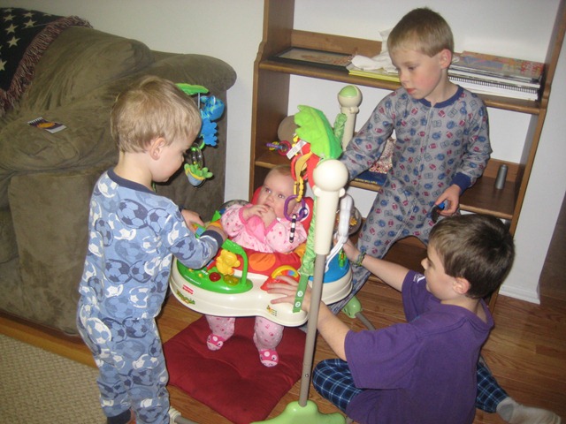 Ladybug is the first in more ways than just being the first girl. She is also the first of my babies to actually stop nursing to look up and talk to me. She is the first of my children to have a dirty diaper blowout (requiring a change of clothes and LOTS of stain remover) almost every day. Believe it or not, my boys didn’t have blowouts at all. She is also now the first of my children to attempt and succeed at the feat of spitting up down the inside of the sleeve of my long sleeve shirt. To the elbow. Can’t wait to see what else she’s first at. I really hope it doesn’t involve more stain remover.