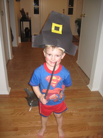 we had this Superman Pilgrim join us for our feast. A feast which I made almost nothing for, I might add. We decided to try the pre-made store kind this year with no prep on our part other than to heat everything up! When dinner was over in less than 10 minutes, I felt fully justified in my laziness! 🙂 It’s just not worth slaving in the kitchen all day when you are only feeding a husband who doesn’t eat a lot, and three small children. Our little 10 lb turkey almost fit in a 9×13 pan it was so small! But it was more than enough turkey for our family of small eaters and we loved not having to cook it all. Happy Holidays everyone!