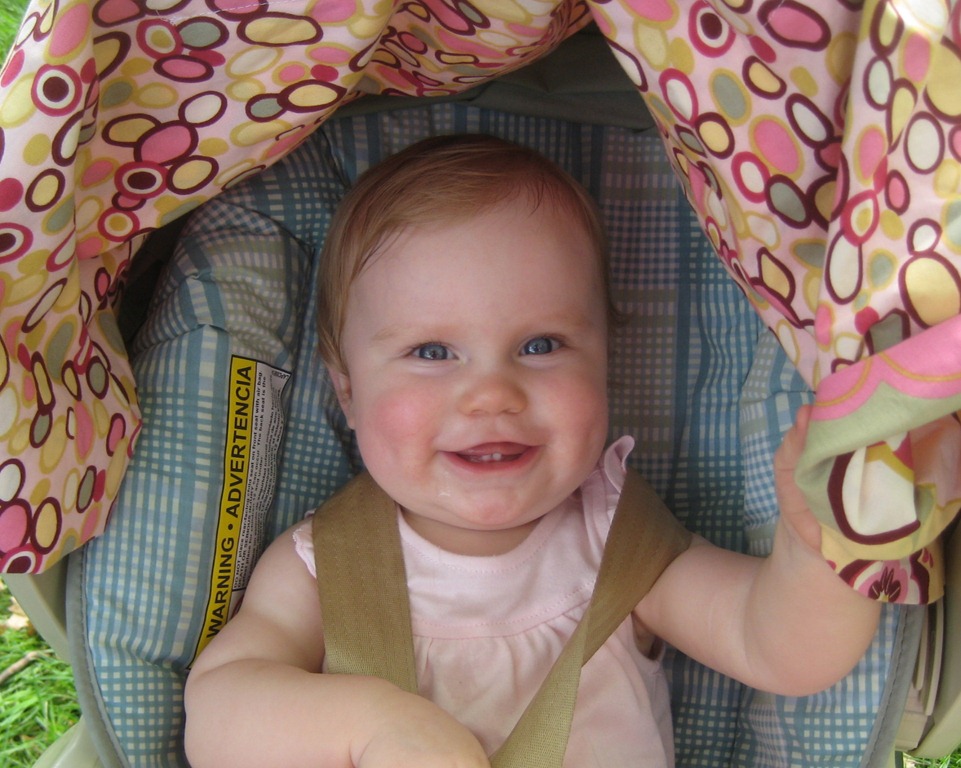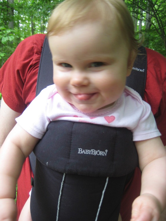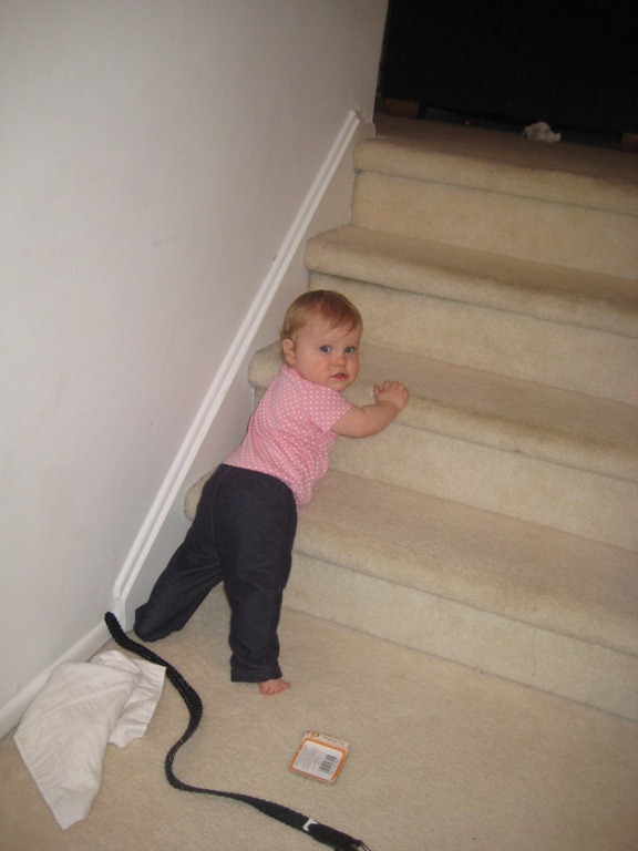 She is venturing out of her family room playpen and into the rest of the house. No, she’s not climbing stairs yet, though she can get herself up on one.