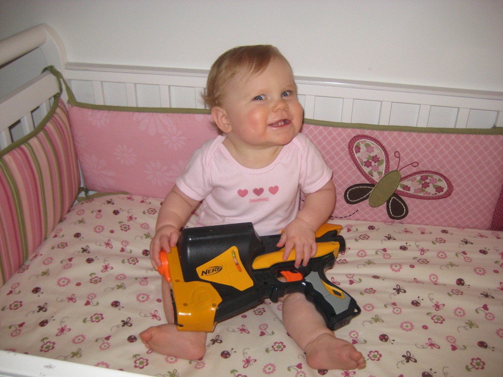 Not only does she like guns, but she army crawls too! She’s ready to join the army.