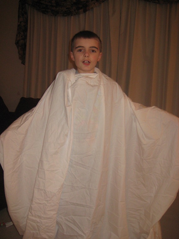 Break time! We go outside and play in the leaves. Cade has decided to memorize the 13th Article of Faith today and so while I rake leaves, he walks in circles around me saying it over and over again while I correct his mistakes. “Ad-mo-ni-tion, Cade, not ‘admition.’” He starts over. Levi follows Liberty around the yard harassing her more then helping her. She finds a spot to sit down and eat leaves and for a minute I don’t have to worry about her running into the street. Reagan is winding up, getting ready to jump in the pile while swinging his ninja sword. “It’s not high enough, Mom.” I rake some more. Cade keeps walking in circles. “We believe all things, we hope all things … .” Reagan and Levi take turns jumping in the pile of leaves while Cade walks in circles chanting. “So, um, Cade, you going to join us over here?” “Yeah, just a minute Mom, I gotta get this right first.” Oh boy. Levi is crying again (he’s been crying all day it feels like) because I didn’t fluff the leaf pile up sufficiently. I talk with Levi about asking for things without crying and he tries again. I fluff up the pile to his specifications and he jumps in happily. My neighbor jogs by and I’m glad she sees us at a good moment. Cade finally gets it right and we celebrate. He gets a few jumps in the pile and we go back inside.