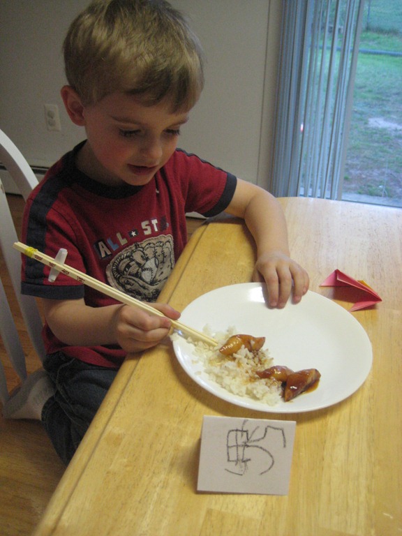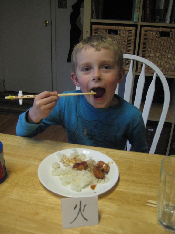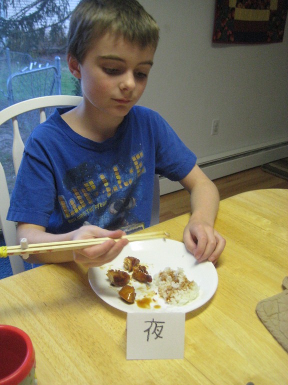 Tonight I made teriyaki chicken that rivals, yes, I dare say, even Happy Teriyaki, my favorite teriyaki place in Lacey, WA. We ate it with chopsticks, of course! And the boys made place settings written in Chinese writing.