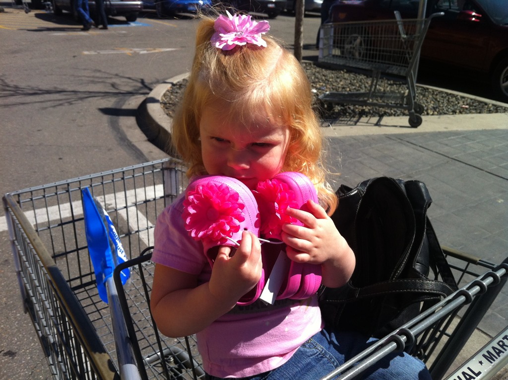 It wasn’t until we were outside and actually saw the psychedelic shoes on her feet that I started to regret my decision a little bit. Allison was already of the opinion that they were a bit loud, and as we went into the next store, I was just opening my mouth to share my regrets with her when a mother and daughter passing us looked at Liberty’s pink shoes and the mother exclaimed, “Oh aren’t those shoes cute, honey?” I shut my mouth. And then, as we walked through the store, everyone noticed the psychedelic pink shoes. And if they didn’t notice and comment to Libby, she would point them out. In the frozen food aisle, the canned food aisle and the checkout line, Liberty made sure people took notice of her pink shoes. “I have pink shoes. They’re so cute,” she would say, stretching her feet out for them to admire. This is the child who up until this point would hardly even smile at the checkout clerk. She tends to be rather reserved around strangers, but not that day. Oh no. She wanted everyone to see her treasure. And thanks to how loud they were, everyone did.