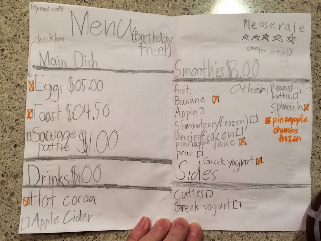 and then said in a fabulous French/German/Italian accent, “Velcome to thee Hymas Keeds Café. Please-a’ choose from z menu vut you vould like to have for-a’ breakfast.”