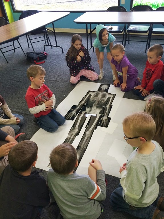Yesterday we started up Co-op again after a two week break and Levi is taking a class on the human body. The kids got to put this whole x-ray skeleton together and label it.