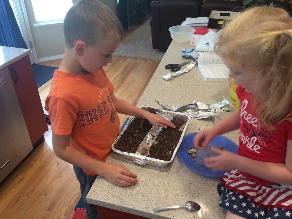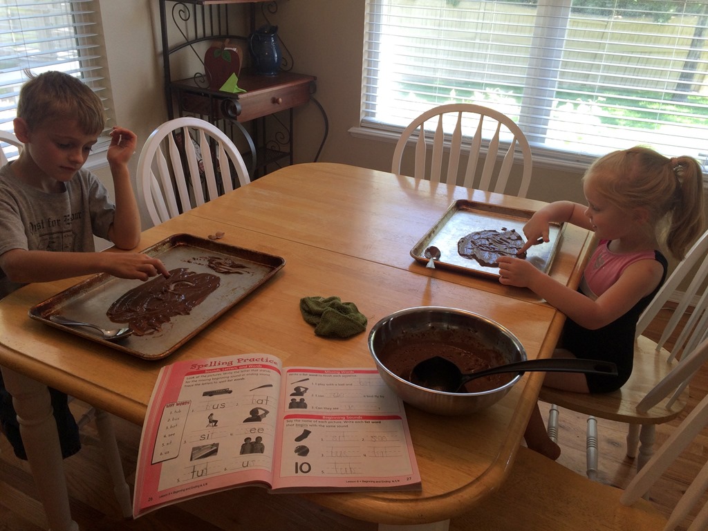 In school Liberty and Levi wrote their spelling words in pudding,