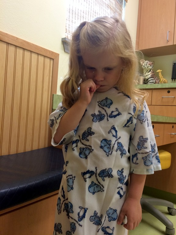 Also this month, our little Kindergartner received her 5 year old shots. The shots themselves were no problem, she didn’t even blink. The blue, not pink or pretty in any way, hospital gown, however, was a real problem.