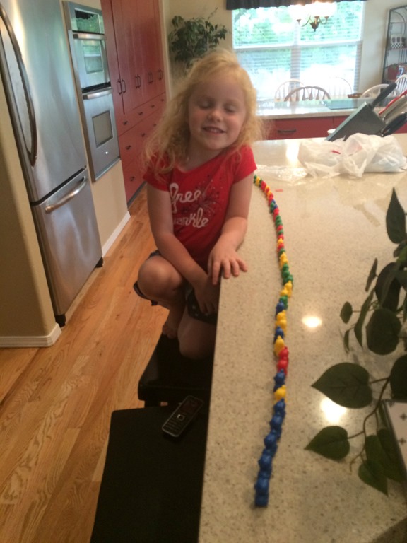 and Liberty is counting everything she can find. She’s learning to skip count by 2’s and she counted all these bears. I can’t remember how many there were, you’ll have to ask her.