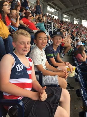 They were giving out free tank tops at the game and Cade, who was sure he would die from the heat and humidity in D.C. put his on right away. This boy, who LOVES baseball, was determined to stay for the entire game. The moms were not too keen on that idea. We were fine giving everyone a taste of the game, but baseball is a very long game and we didn’t want to deal with drunk crowds at the end. I was gearing up for a fight with Cade about it, but the sun did my fighting for me. For a few hours it was cool and pleasant where we were sitting, but then the sun moved and it got really hot again. All the kids were happy to leave before the end of the game thanks to the heat.