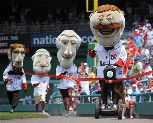 After Ford’s Theatre, Alli decided to hit the Smithsonians some more while the rest of us went to the Nationals baseball game. I was not very excited about this event beforehand, but it was actually pretty fun! The subway was a sea of red-people dressed up for the game. The Nationals are my kind of baseball team. It’s all about America, lots of national pride goin on. The mascot is a bald eagle and they have the “Running President’s Race” every game starring these American presidents: