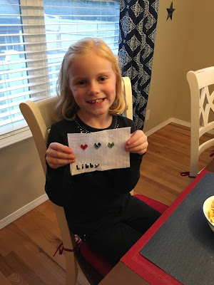 Liberty has learned to cross stitch! She’s done nothing but cross stitch since Sunday when I taught her. She made the letters up herself.