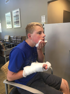 Rock went to pick him up and take him to the urgent care after the paramedics determined that his thumb might be broken and his chin would need stitches. And it was a doosy of a gash. Levi had 17 stitches in his forehead after running into a corner in the kitchen, but this was a much uglier wound. They only gave him 7 stitches, however, and decided after X-rays that his thumb was just sprained.