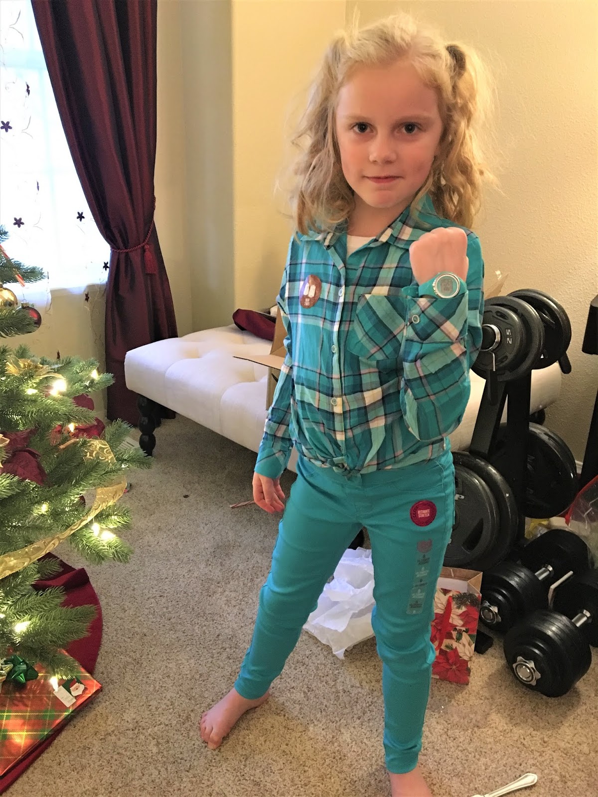 Her second favorite gift; an Aunt Karla worthy outfit plus matching watch from Santa.