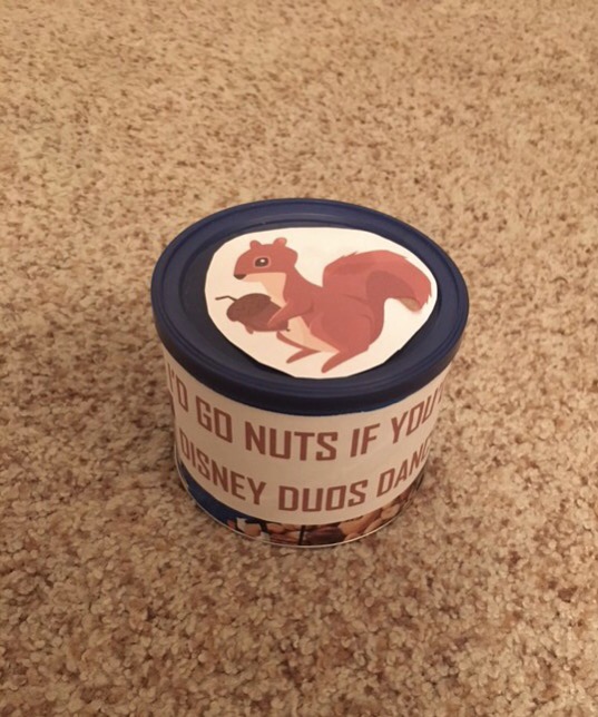 It’s hard to see but it says “I’d go nuts if you’ll go with me to the Disney Duds Dance”
