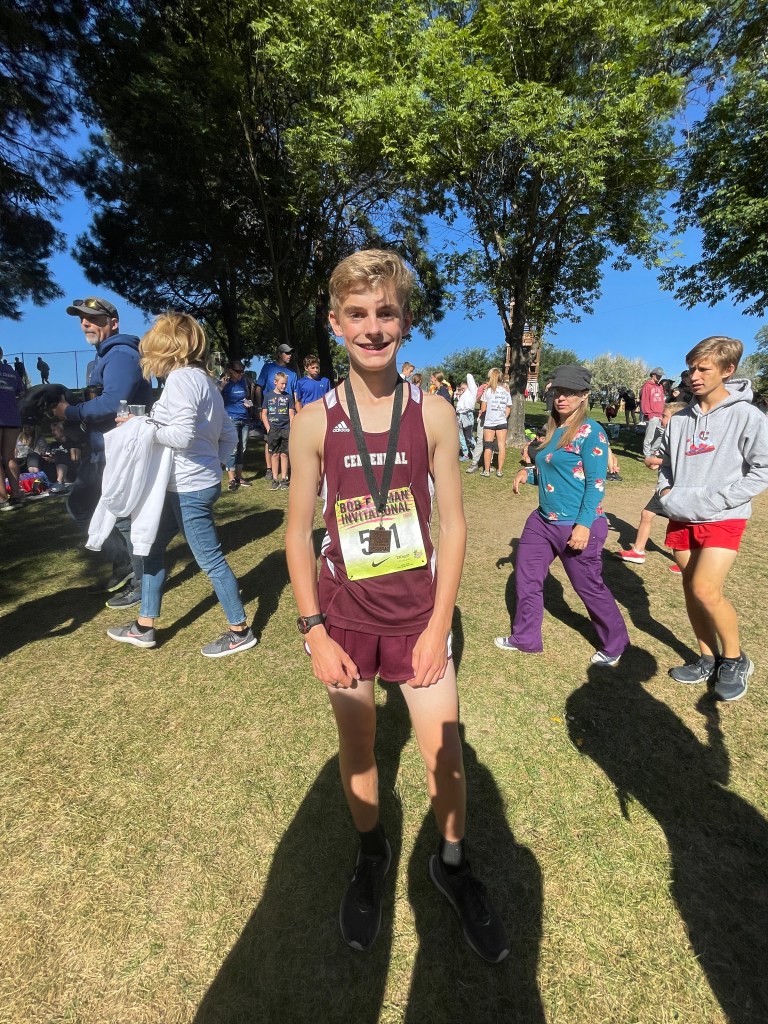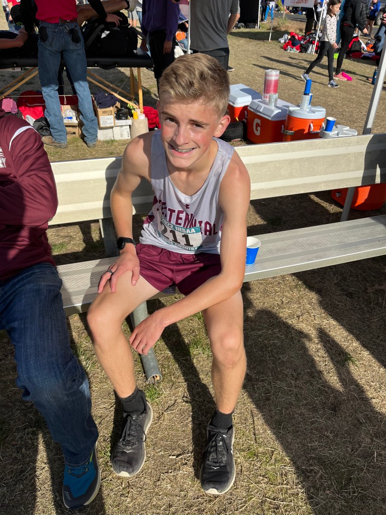 And then it was on to the state competition in Lewiston Idaho, 5 hours away. Rock drove there to watch the race and texted me live updates. Centennial did Awesome! They were one point away from the 4th place trophy. Levi PR’d again with the sub 17 minute time of 16:55. He is the 2nd fastest freshman in Centennial High School history, behind the fastest by only 1 second. Rock was a cross country runner as well, but he wasn’t this fast, so I keep telling him that, obviously, it is MY genes that have made Levi this fast. 😉