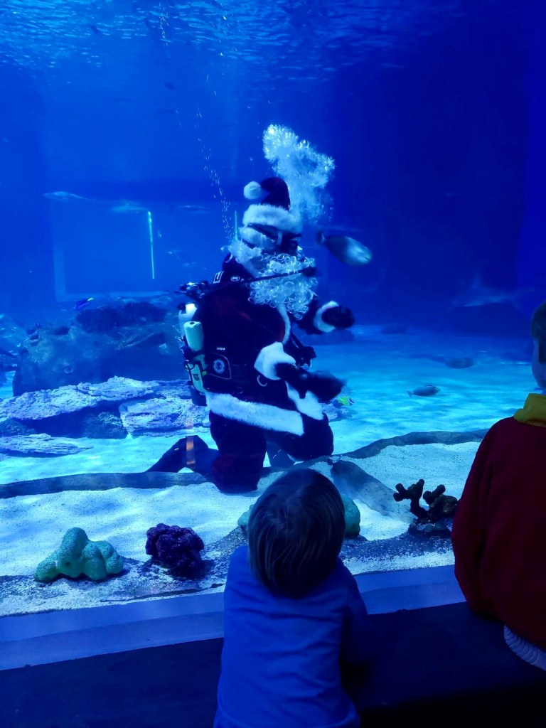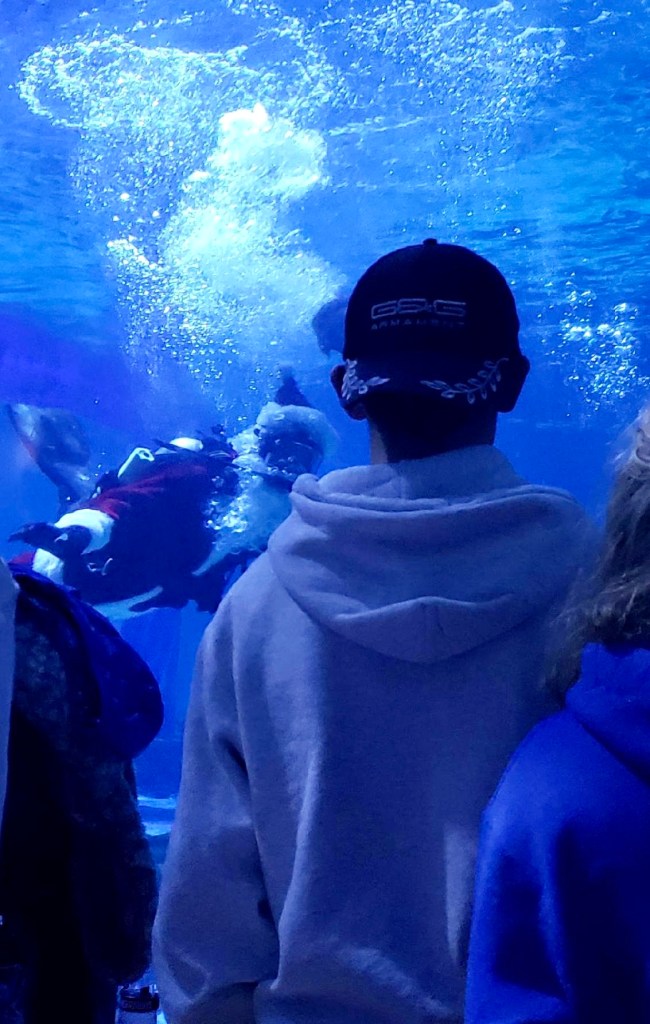 After campus, Sarin took the kids to the aquarium for the behind the scenes tour. She knows everything about the aquarium now after working there for a year. While they were at the shark tank a special visitor dropped in to feed the fish.