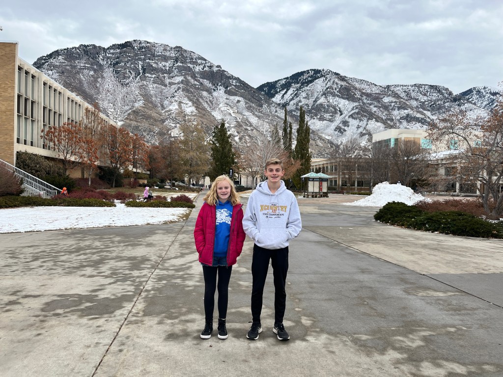 On our tour of campus we stopped at the BYU bookstore and Rock showed the kids where he basically got arrested for shop lifting. It’s a good story-ask him about it sometime. He certainly looks the part of a criminal in this picture for sure. While in the library he told them about the time he kissed a girl (not me) in the stacks. They were begging him for stories the whole trip after those two.